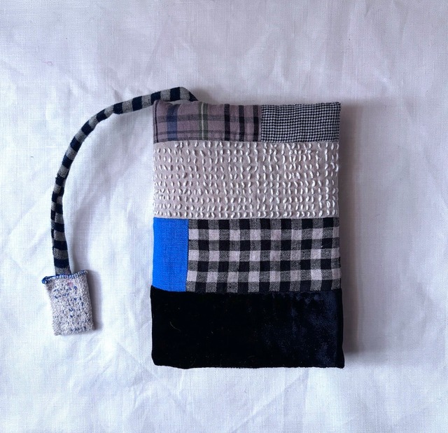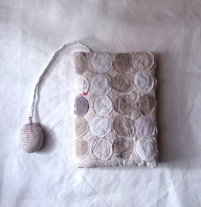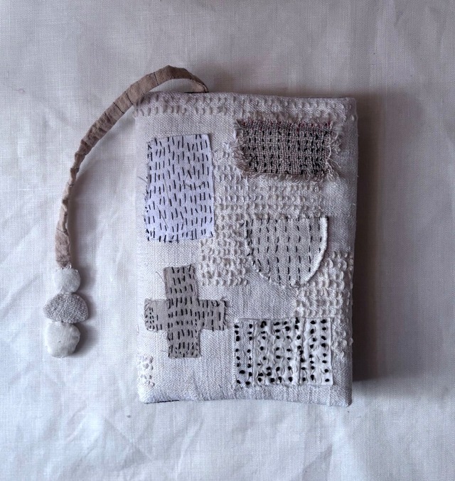 いつもはリネンを主に制作していますが、この作品は質感の違うビロードをリネンと繋いで制作しました。 質感が違うものが繋がり、グッと大人っぽくなった気がします。 栞の先の日の丸がお気に入りです。 古い布を使用しています。 size:16cm×24cm(おおよそ)