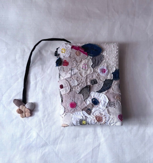 黒い麻の布に、チクチクと花を刺繍しました。 なかには咲いてない花もあります。 それはこれから咲く花です。 表紙の裏にも1輪の花を刺しました。 古い布を使用しています。 size:16cm×24cm(おおよそ)