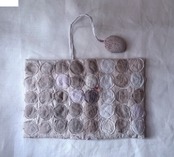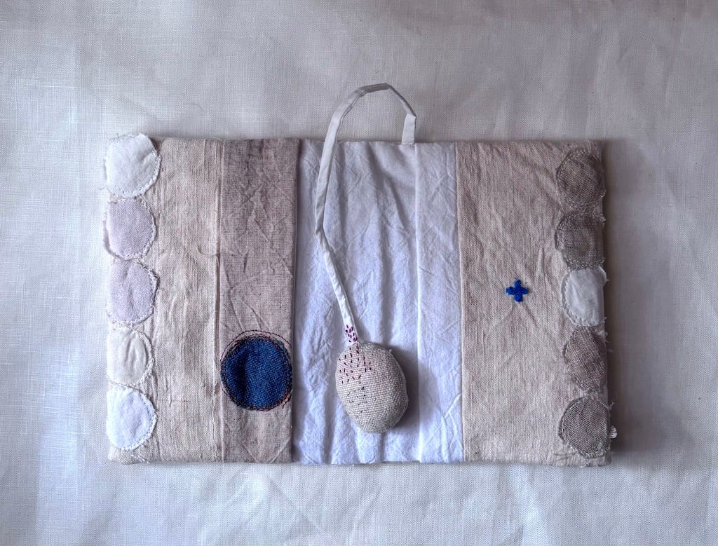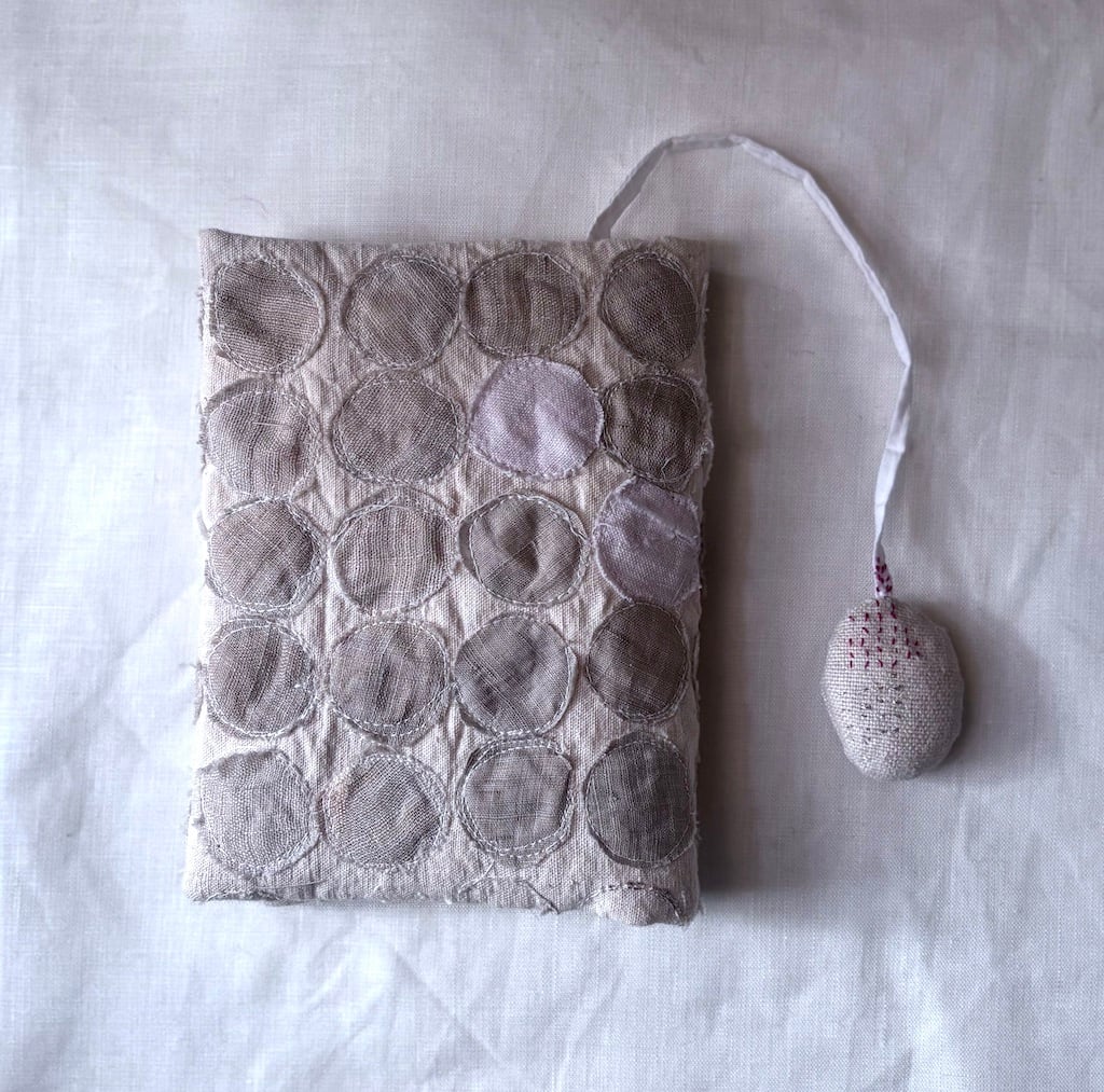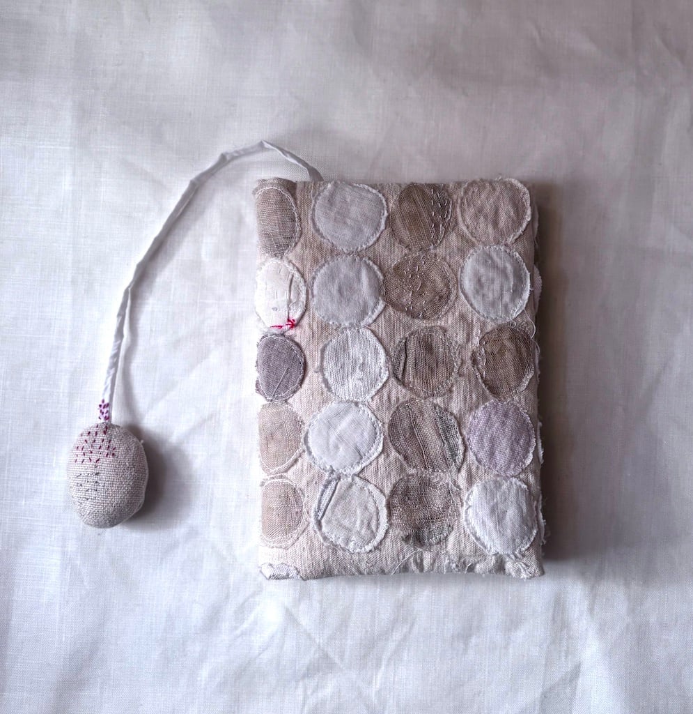 古い麻の布に丸いドットをミシンステッチで付けました。